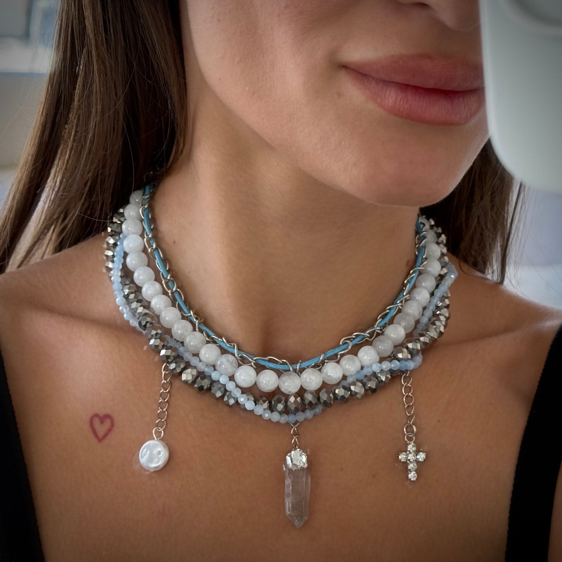 Choker made of moonstone, aquamarine, and a clear quartz pendant.