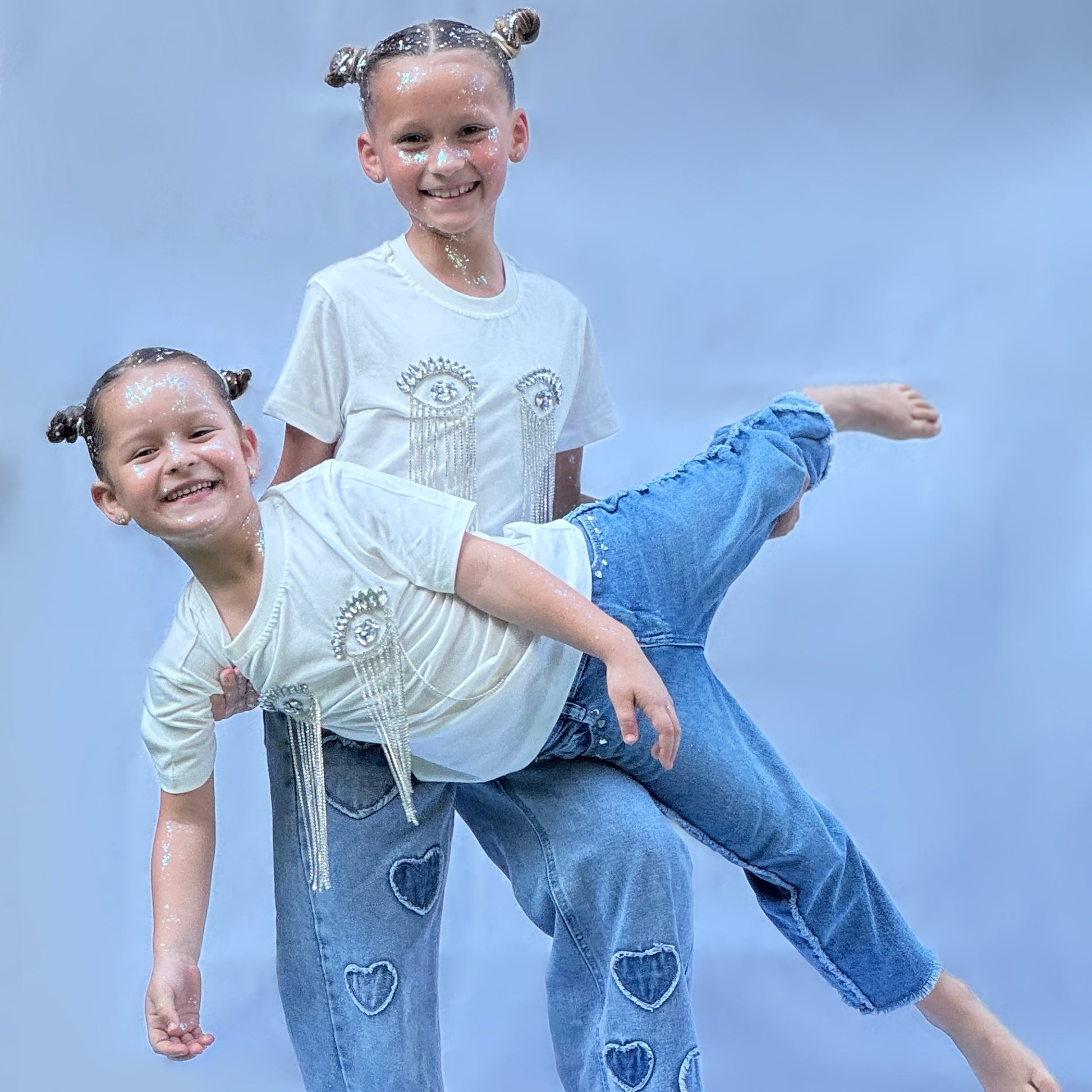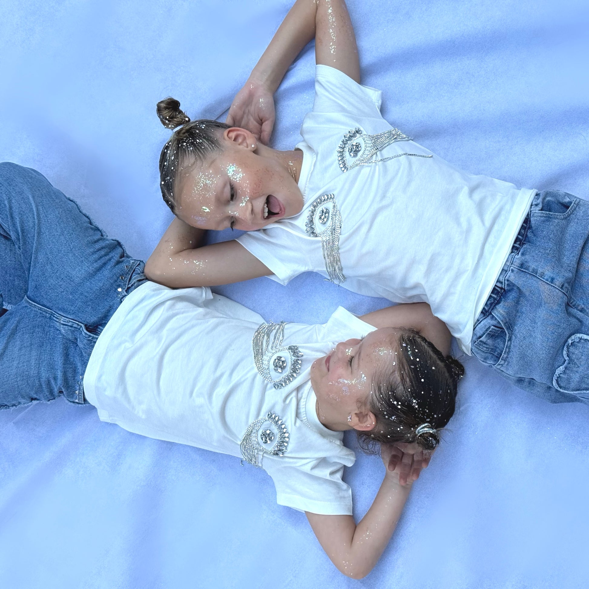Kids fancy T-shirt in soft jersey. Ribbed neckline and heavily dropped shoulders. Decorated with crystal rhinestones chain trim.